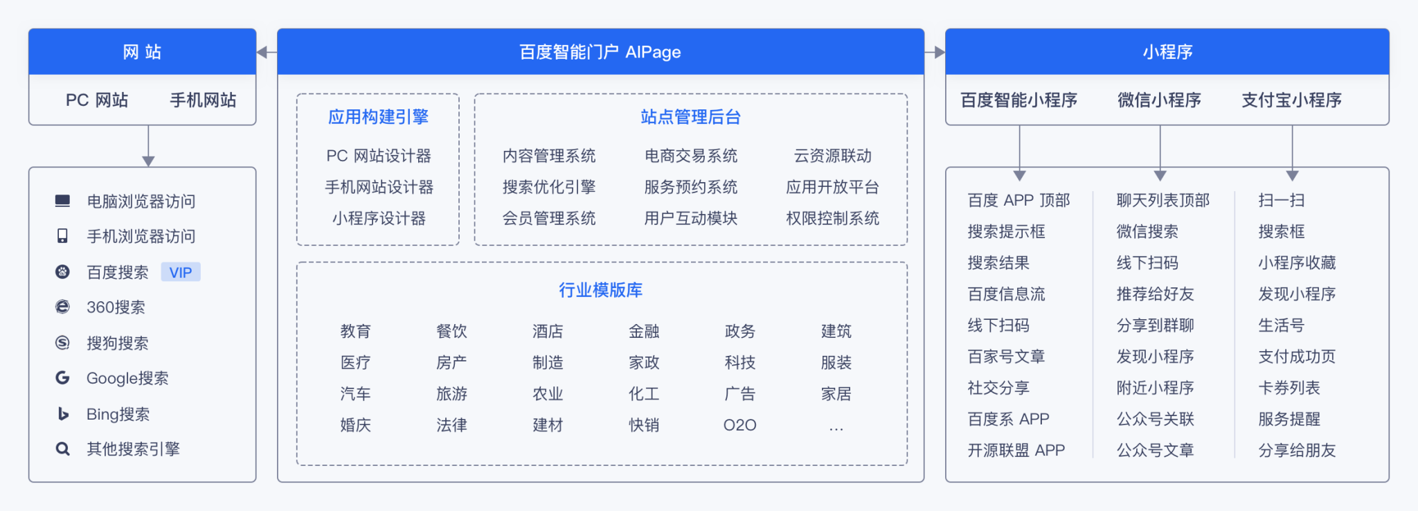 百度智能门户(AIPage)是百度智能云面向中小企业用户推出的一款智能化构建网站和小程序的SaaS应用产品。用户无需任何编程基础即可上手操作,如同做PPT一样拖拽式设计制作自己的网站和小程序,内置海量行业模版及组件,轻松打造“PC网站、手机网站、百度智能小程序、微信小程序、支付宝小程序”五个端的站点。产品支持电商及预约功能,可广泛适用各类行业用户的实际应用场景。强势集成多项百度搜索权益及AI智能获客能力,帮助企业精准把握每一条商机信息,高效提升推广和转化效果!