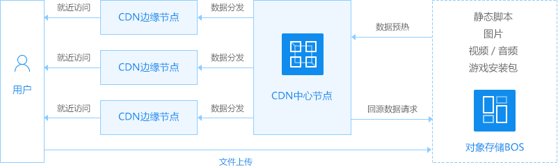 BOS作为海量文件存储源,静态图片、视频文件、下载包、APP更新包等均放在BOS上。通过开启CDN加速并使用BOS作为源站,用户通过CDN节点就近访问文件。 同时,BOS作为源站,可根据数据变化自动刷新CDN边缘数据,全球用户可第一时间访问最新内容。