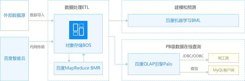 对象存储BOS + 百度MapReduce BMR +百度机器学习BML + 百度OLAP引擎Palo