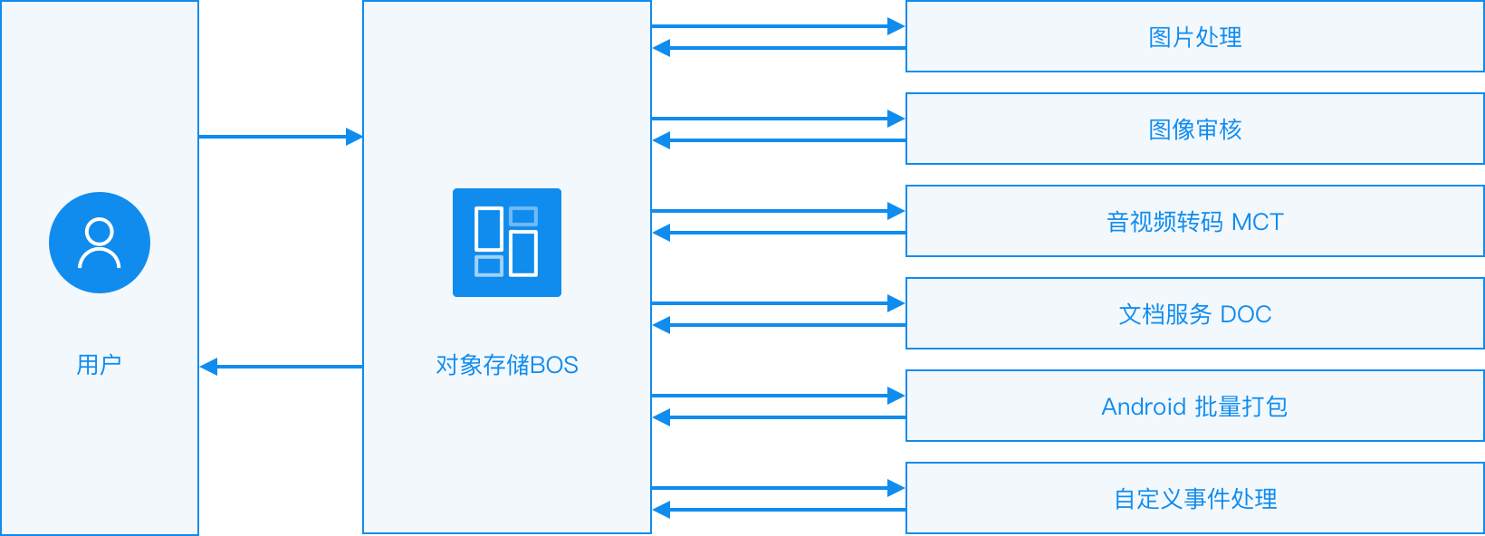 BOS提供丰富的数据处理功能。您可以对上传到BOS的图片进行裁剪、旋转、加水印等图片处理,也可以对图片内容进行审核。您还可以对音视频文件、文档文本进行转码播放,以及批量创建Android渠道包。