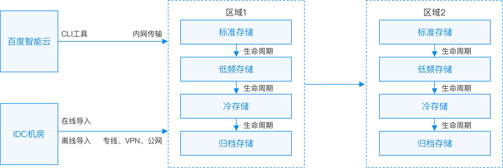 BOS提供四种存储类型,用户可按需使用和切换。 同时,BOS支持生命周期管理,您可以定义生命周期规则实现数据的自动冷热沉降删除,从而进一步降低存储成本。