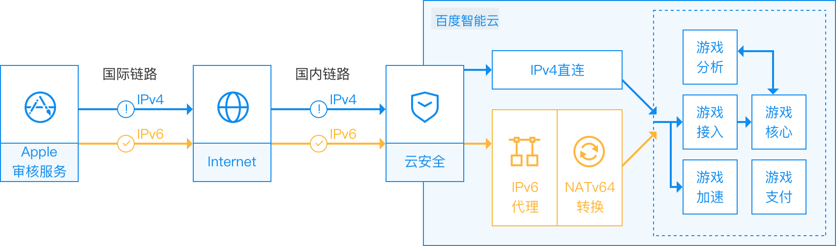 客户使用百度智能云的审核加速服务,可以让客户在不改变部署环境的情况下,借助百度智能云超高IPv6带宽+NATv46转换,大大提高了苹果审核的速度。