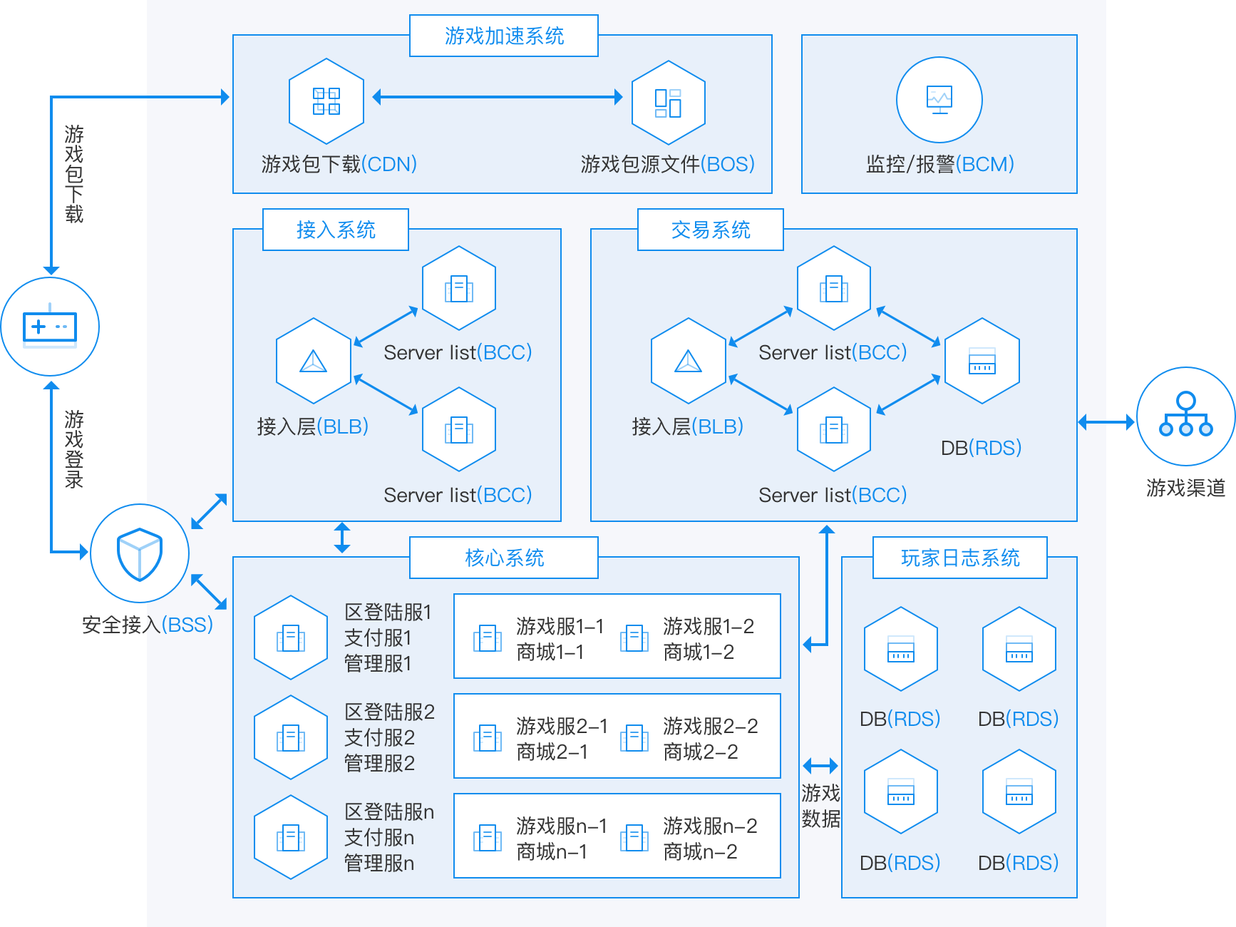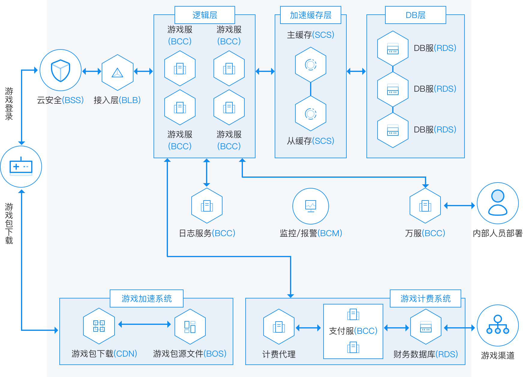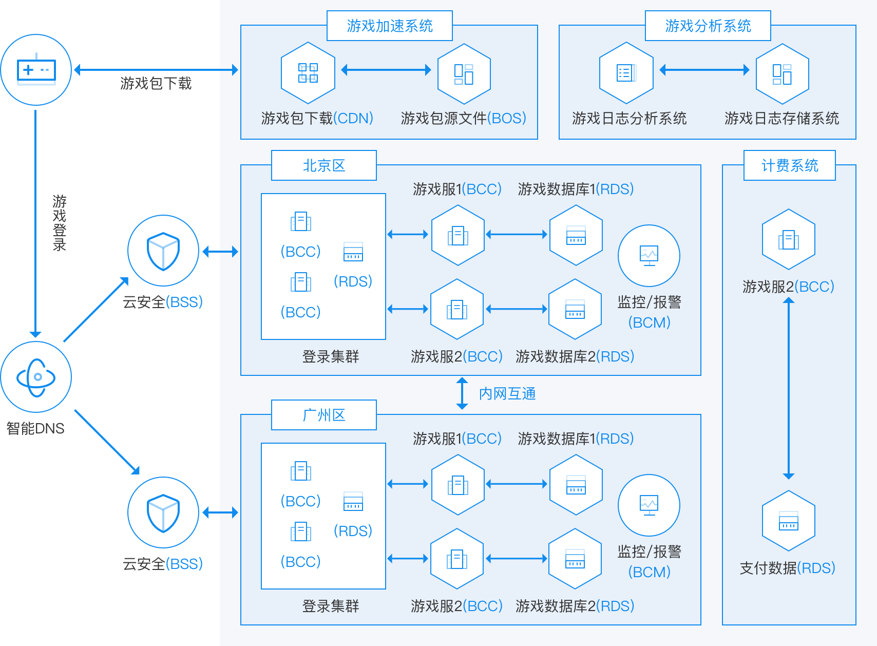 百度智能云拥有顶级的基础设施资源与技术、行业领先的大数据和视频服务、专业的游戏方案咨询、强大的游戏生态系统,帮助游戏客户完美解决运行卡顿、掉线、攻击停服、玩家分析缺失、游戏直播接入困难等常见问题