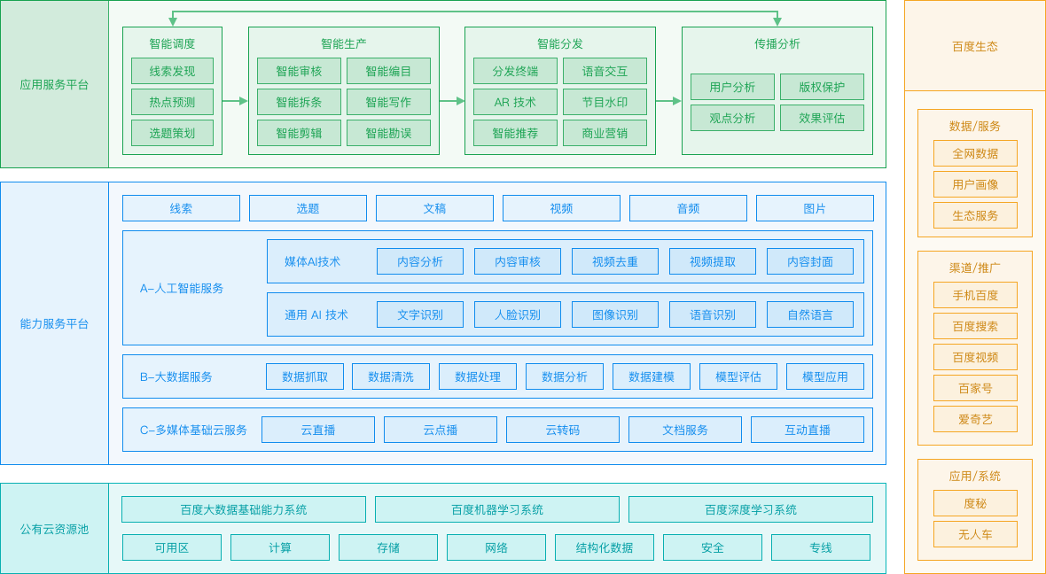 ABC Inspire传媒行业, 基于百度人工智能/大数据/多媒体基础云服务,为传媒行业各个业务环节进行赋能。