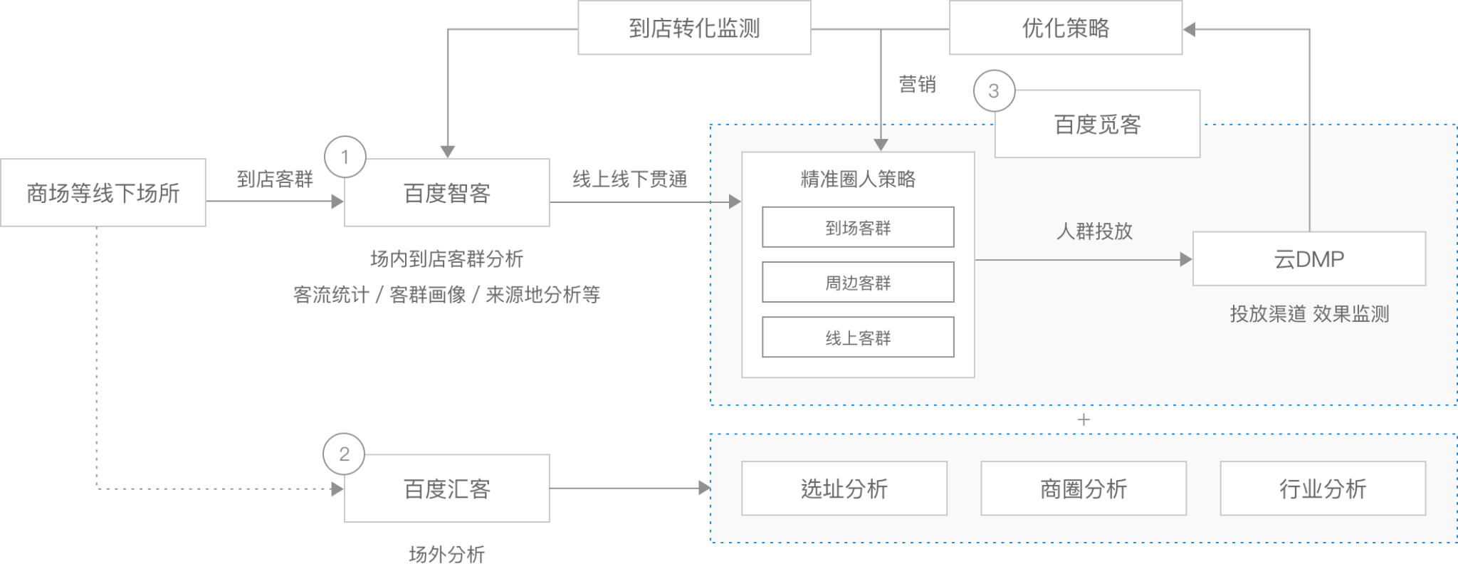 结合百度大数据能力,识别场内场外潜在顾客,帮助商家精准营销。同时借助百度推广的渠道优势,扩大媒体投放覆盖面,构建全域营销闭环